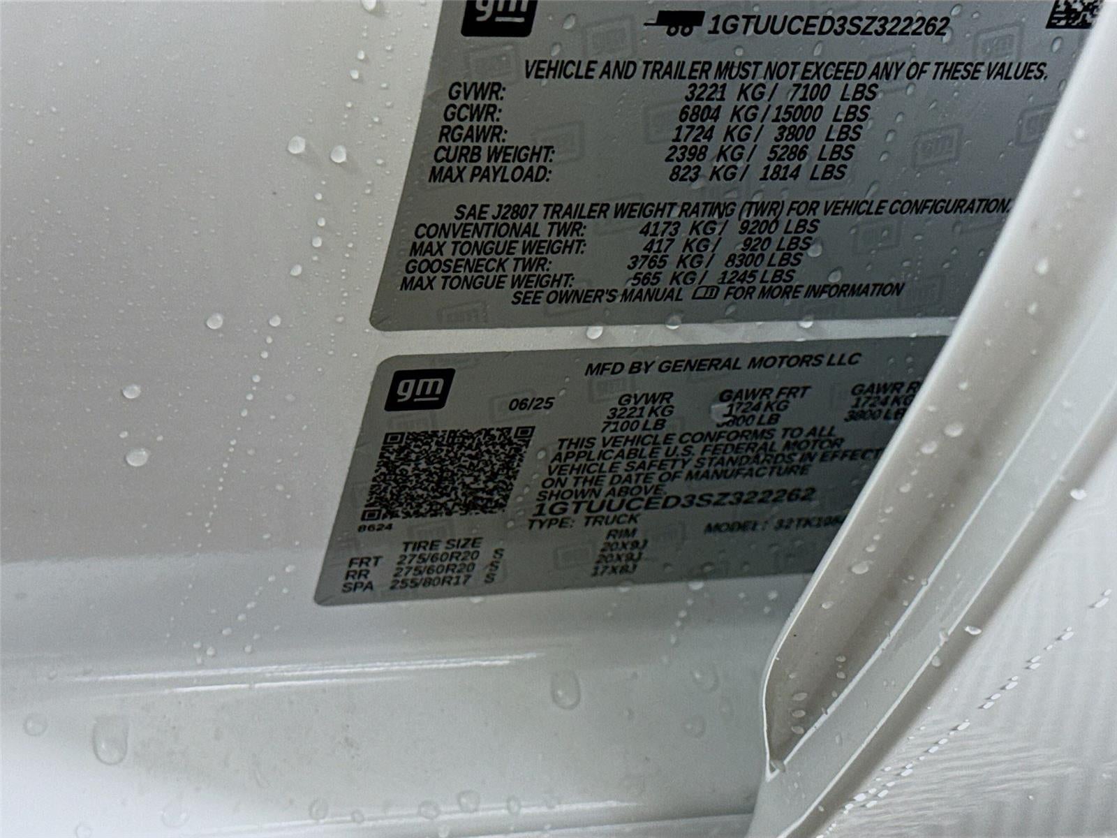 EMISSIONS, FEDERAL REQUIREMENTS, ENGINE, 5.3L ECOTEC3 V8, TRANSMISSION, 10-SPEED AUTOMATIC WITH ELECTRONIC PRECISION SHIFT, ELECTRONICALLY CONTROLLED, GVWR, 7100 LBS. (3221 KG), REAR AXLE, 3.23 RATIO, WHEELS, 20"" X 9"" (50.8 CM X 22.9 CM) 6-SPOKE HIGH GLOSS BLACK PAINTED ALUMINUM, TIRES, 275/60R20 ALL-SEASON, BLACKWALL, SUMMIT WHITE, SEATS, FRONT BUCKET, JET BLACK, CLOTH SEAT TRIM, AUDIO SYSTEM, 13.4"" DIAGONAL PREMIUM GMC INFOTAINMENT SYSTEM WITH GOOGLE BUILT IN APPS SUCH AS NAVIGATION AND VOICE ASSISTANCE, INCLUDES COLOR TOUCH-SCREEN, MULTI-TOUCH DISPLAY, AM/FM STEREO, PREFERRED PACKAGE, SIERRA SAFETY PLUS PACKAGE, ELECTRONIC PRECISION SHIFT AND STEERING COLUMN PADDLE SHIFTERS, COOLING, EXTERNAL ENGINE OIL COOLER, COOLING, AUXILIARY EXTERNAL TRANSMISSION OIL COOLER, ALTERNATOR, 170 AMPS, WHEELHOUSE LINERS, REAR, LIGHTING, PERIMETER, MIRROR CAPS, HIGH GLOSS BLACK, WINDOW, POWER, REAR SLIDING WITH REAR DEFOGGER, BEDLINER, SPRAY-ON, BOSE SOUND SYSTEM, PREMIUM 7-SPEAKER SYSTEM, CENTER CONSOLE, FLOOR-MOUNTED, LPO, ALL-WEATHER FLOOR LINER, 1ST AND 2ND ROWS, IN-VEHICLE TRAILERING APP, UNIVERSAL HOME REMOTE, ADAPTIVE CRUISE CONTROL, WIRELESS CHARGING, USB PORTS, 2, CHARGE/DATA PORTS LOCATED INSIDE CENTER CONSOLE, HITCH VIEW, HD SURROUND VISION, TRAILER CAMERA PROVISIONS AND TRAILER VIEWING SOFTWARE, FRONT AND REAR PARK ASSIST, ULTRASONIC, TRAILER SIDE BLIND ZONE ALERT, REAR CROSS TRAFFIC BRAKING, REAR PEDESTRIAN ALERT