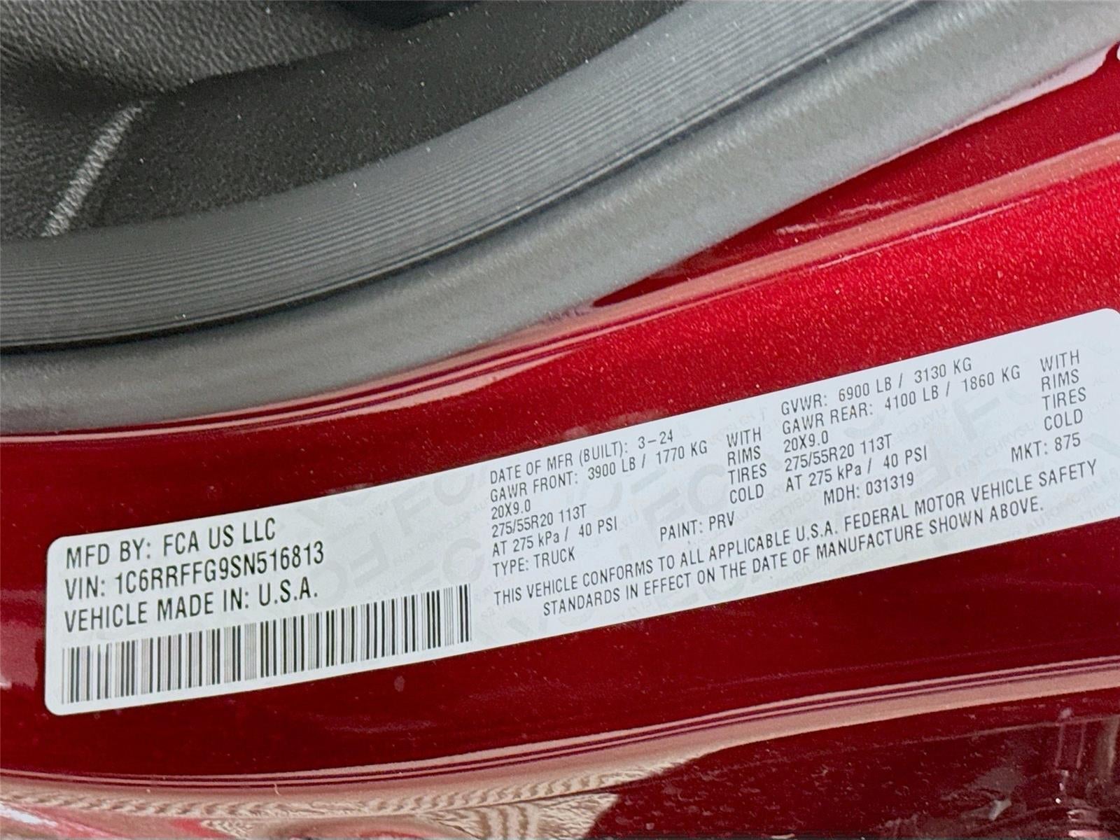 ENGINE: 3.6L V6 24V VVT ETORQUE UPG I, TRANSMISSION: 8-SPEED AUTOMATIC (850RE), QUICK ORDER PACKAGE 23Z BIG HORN, 3.21 REAR AXLE RATIO, WHEELS: 20"" X 9"" ALUMINUM CHROME CLAD (WRK), TIRES: 275/55R20 OWL ALL SEASON, DELMONICO RED PEARLCOAT, BLACK, DELUXE CLOTH BUCKET SEATS, GVWR: 6,900 LBS, BED UTILITY GROUP, BIG HORN LEVEL 2 EQUIPMENT GROUP, SPORT APPEARANCE PACKAGE, ANTI-SPIN DIFFERENTIAL REAR AXLE, 33 GALLON FUEL TANK, FRONT LICENSE PLATE BRACKET, RADIO: UCONNECT 5 NAV W/12.0"" DISPLAY, 9 AMPLIFIED SPEAKERS W/SUBWOOFER, MOPAR FRONT & REAR RUBBER FLOOR MATS, REAR UNDERSEAT COMPARTMENT STORAGE